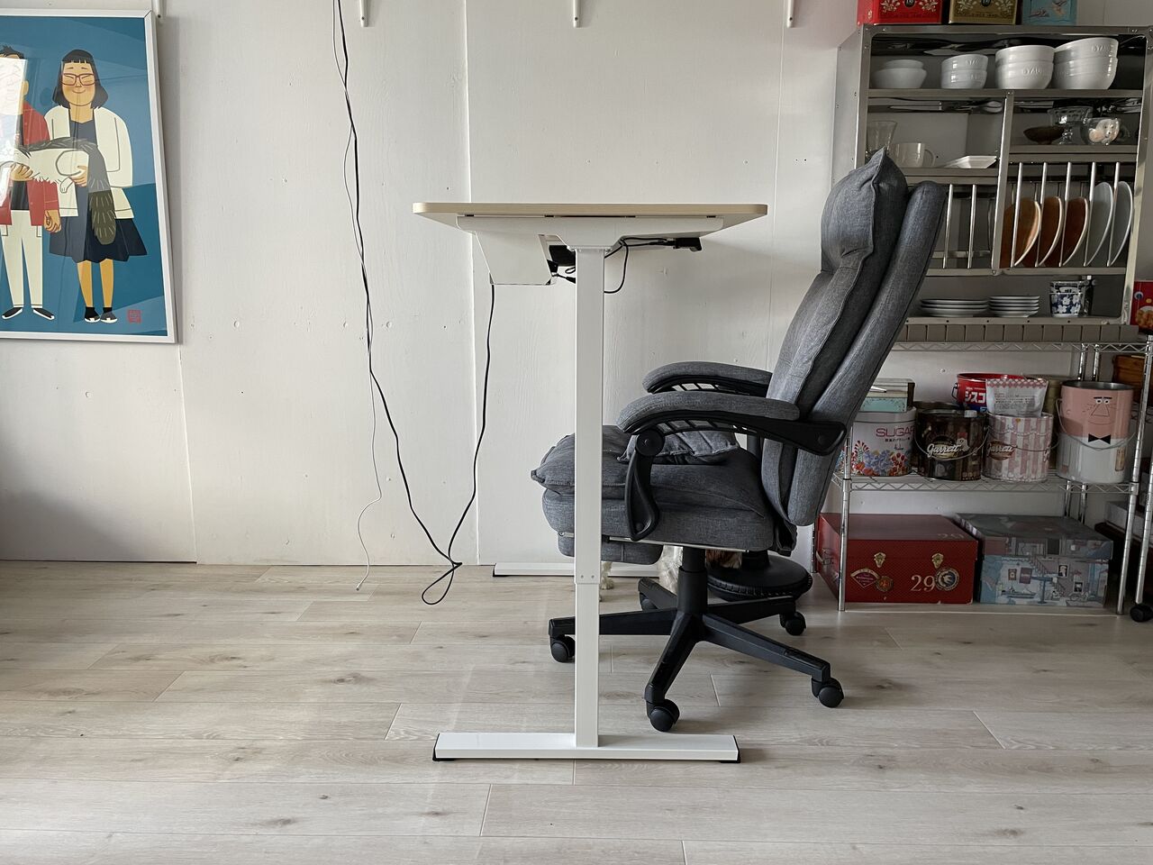私は15年ほど前に交通事故に遭い腰にボルトが入っていて、重度の腰痛持ちのため、椅子によっては1時間ほどで座っていられなくなり、デスクやダイニングテーブルも70センチなど低めだと腰痛が出てしまっていたのですが、スタンディングデスクにかえてからかなりいい感じ。