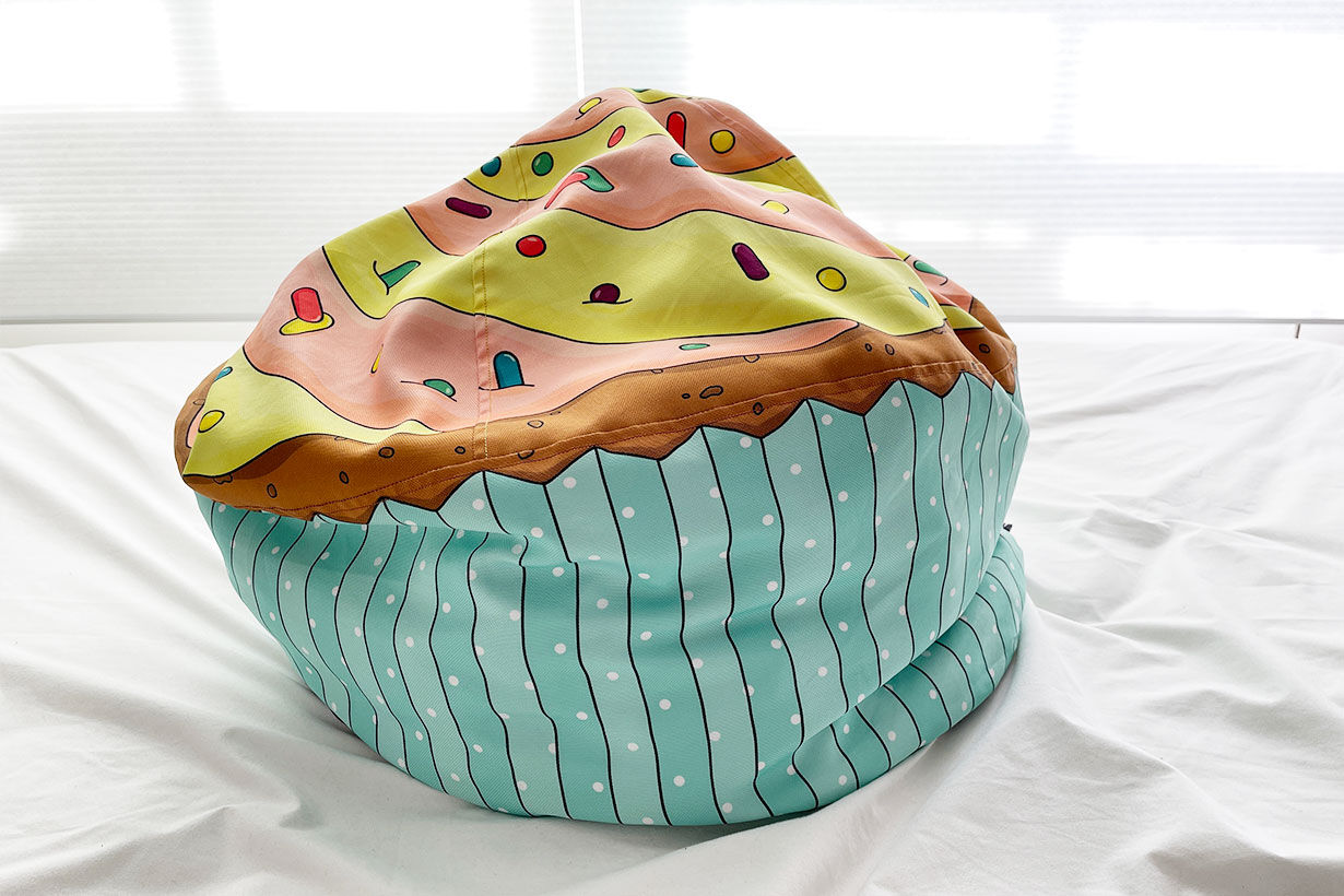 ↓タオルケットはカップケーキ柄のビーズクッションカバーに収納