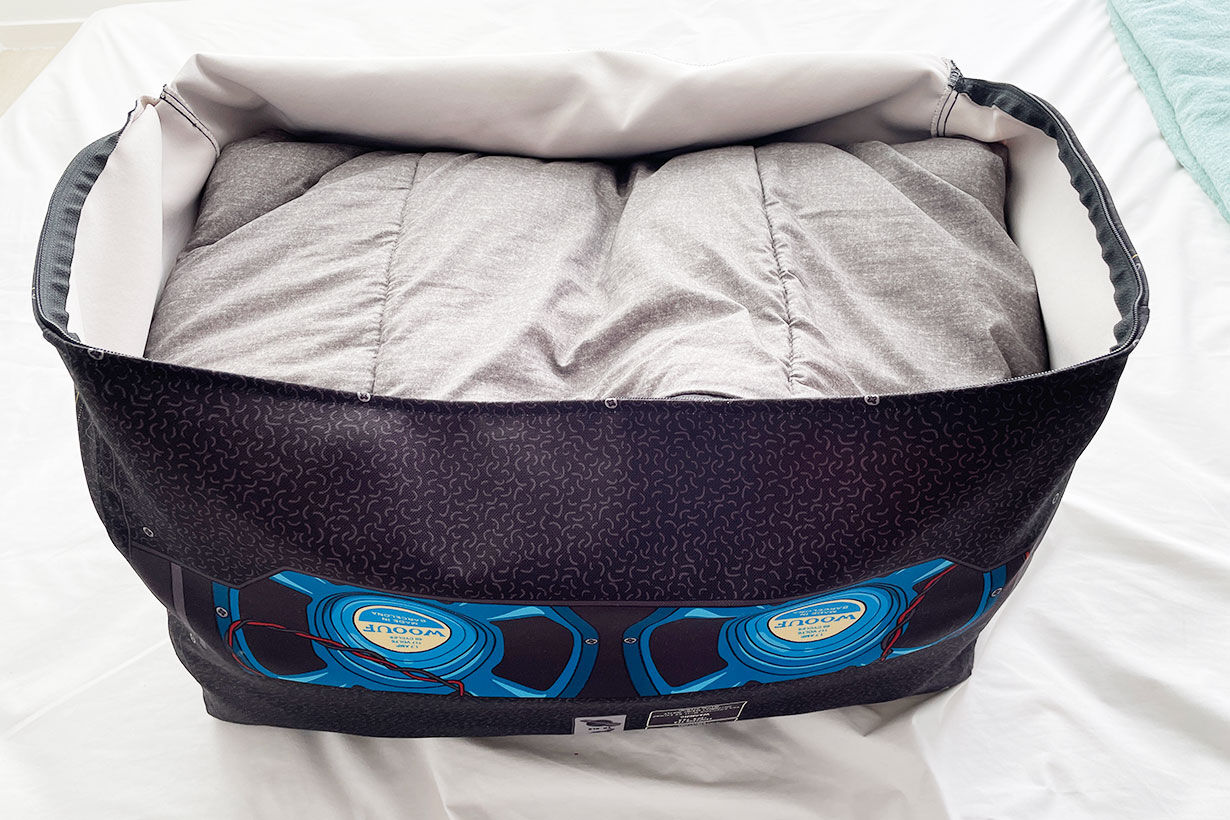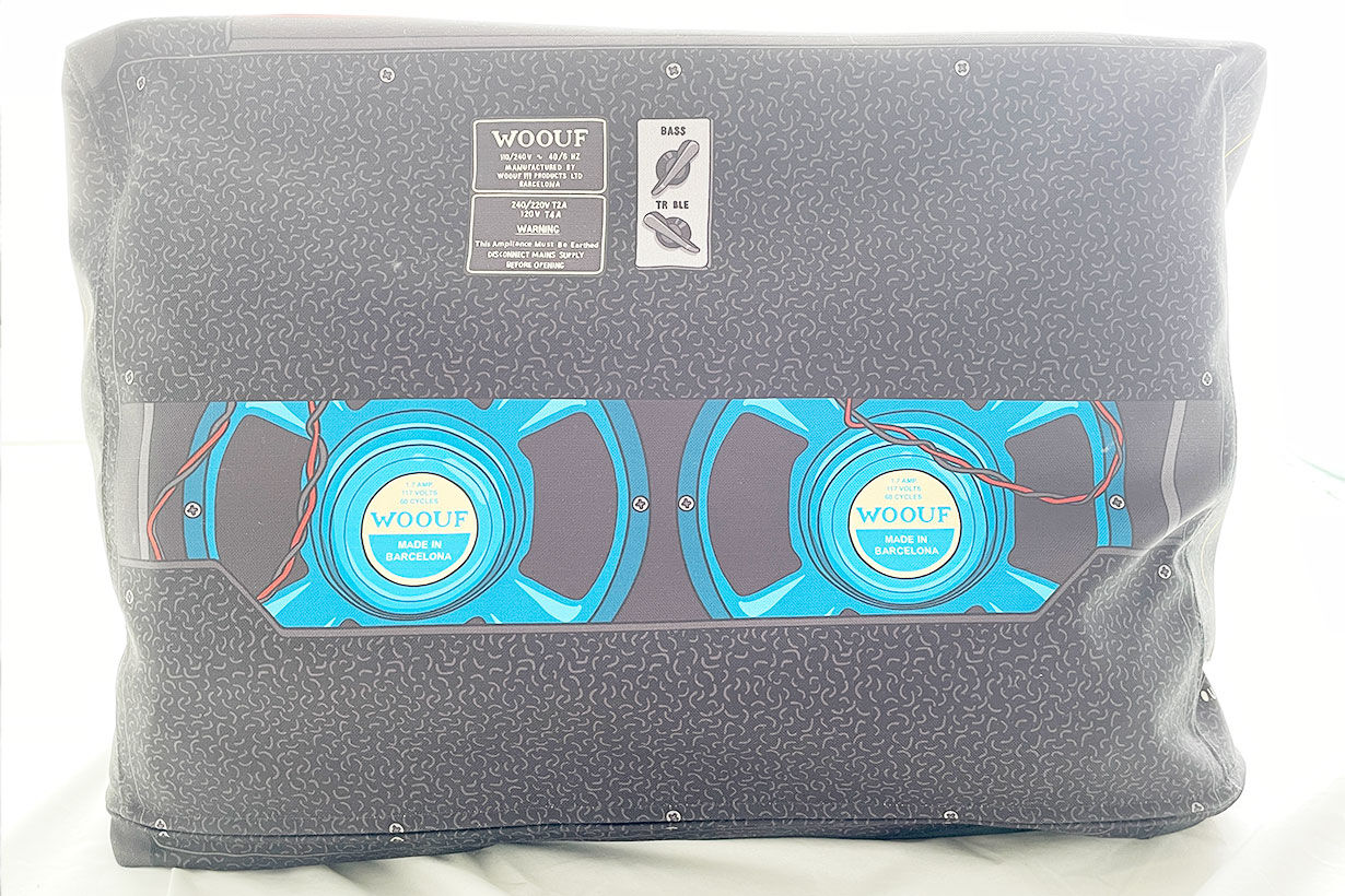 ↓掛け布団代わりの寝袋はギターアンプ柄のクッションカバーに収納