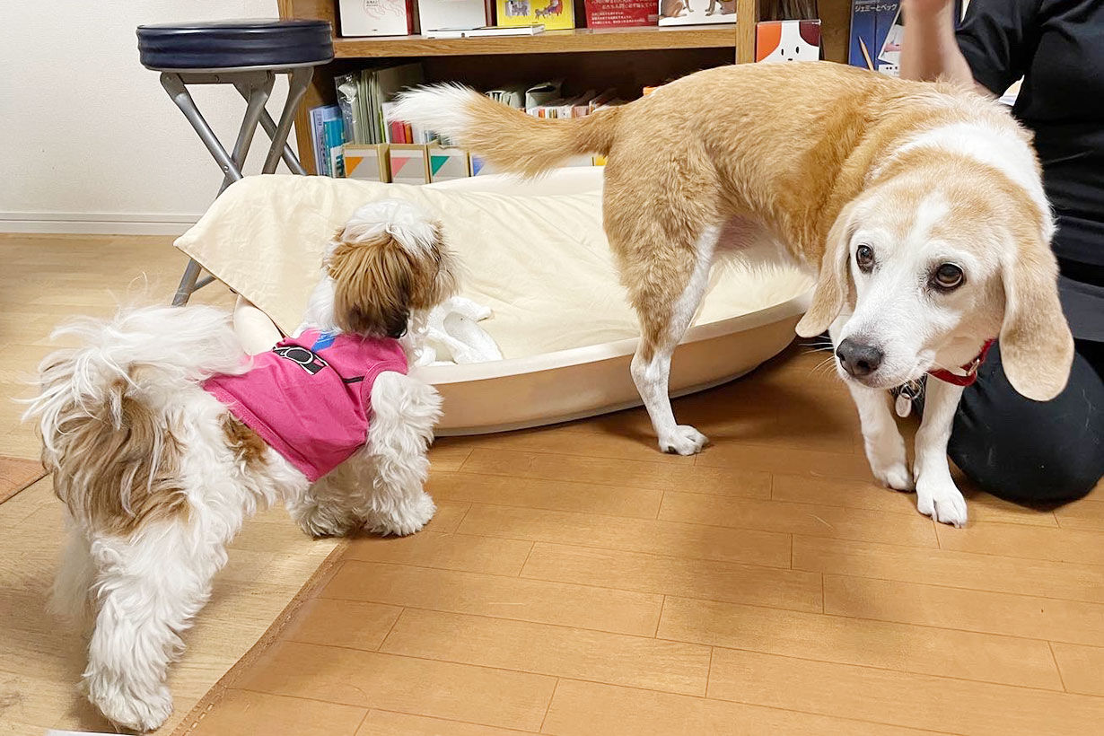 この日の事務所にいたのは、ききちゃん、ひでちゃん、だいちゃんという10キロ以上の中型犬ばかりでしたが、ものおじすることなく全員に友好的にできてました。