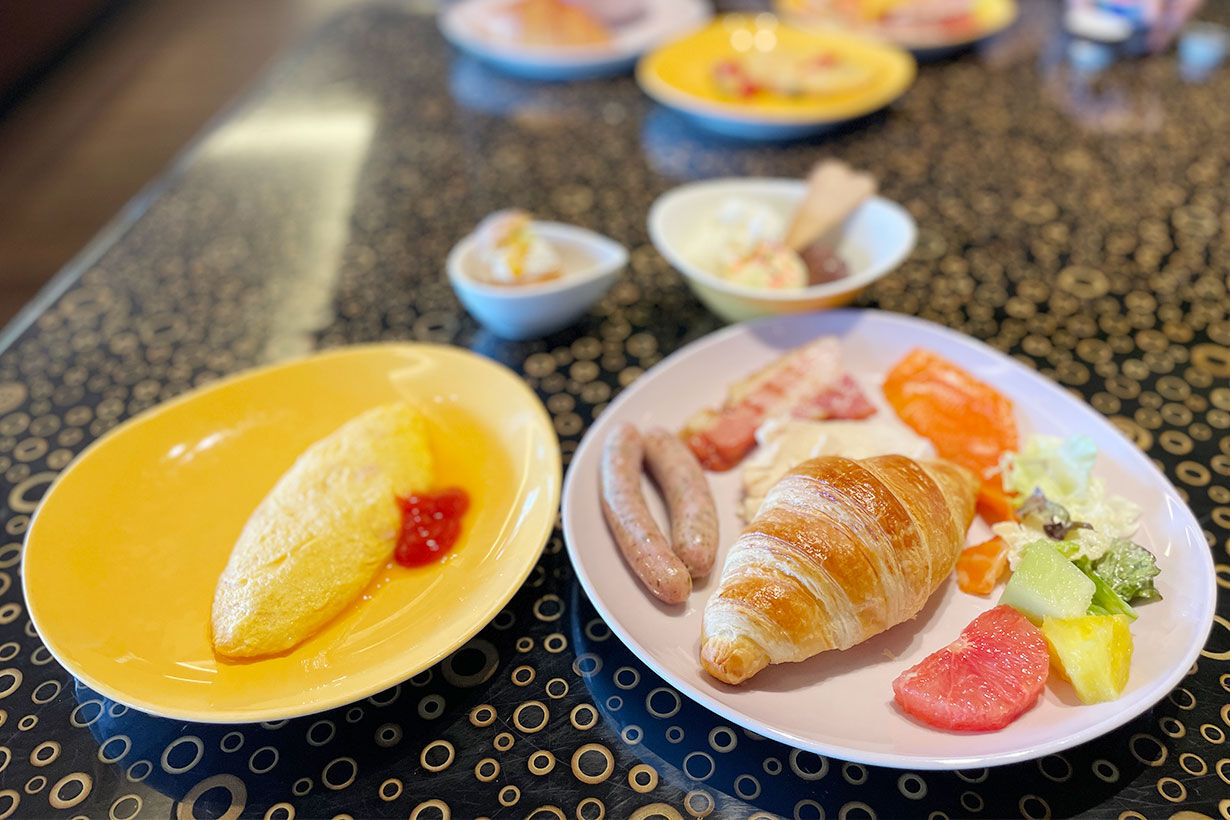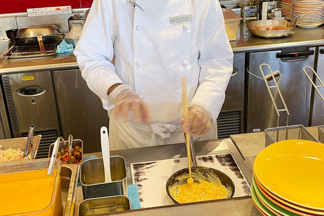 ホテルの朝食ビュッフェの定番、目の前でシェフがオムレツ焼いてくれるやつもやってました。