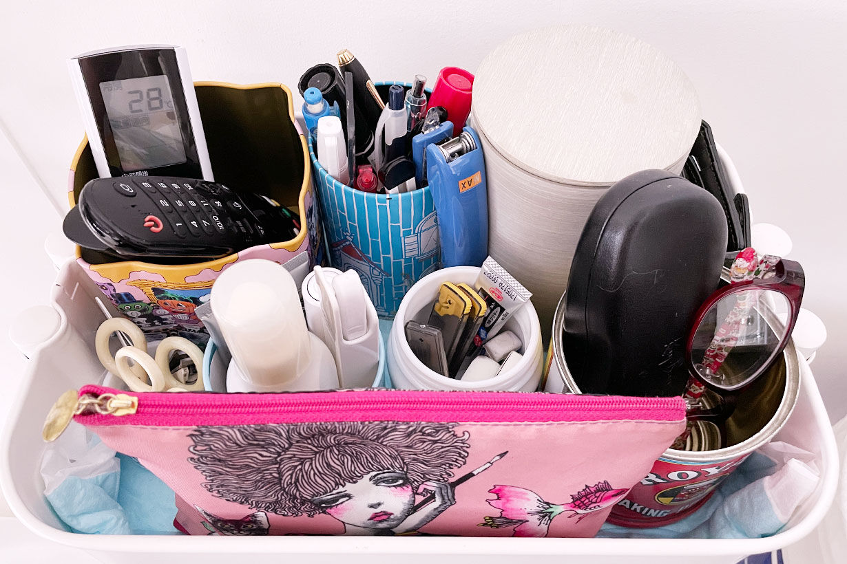 デスクの上に散らかったものを片付けたいときに「とりあえず」で、ぽいぽい放り込むことで、収集つかないぐらいごちゃごちゃに。