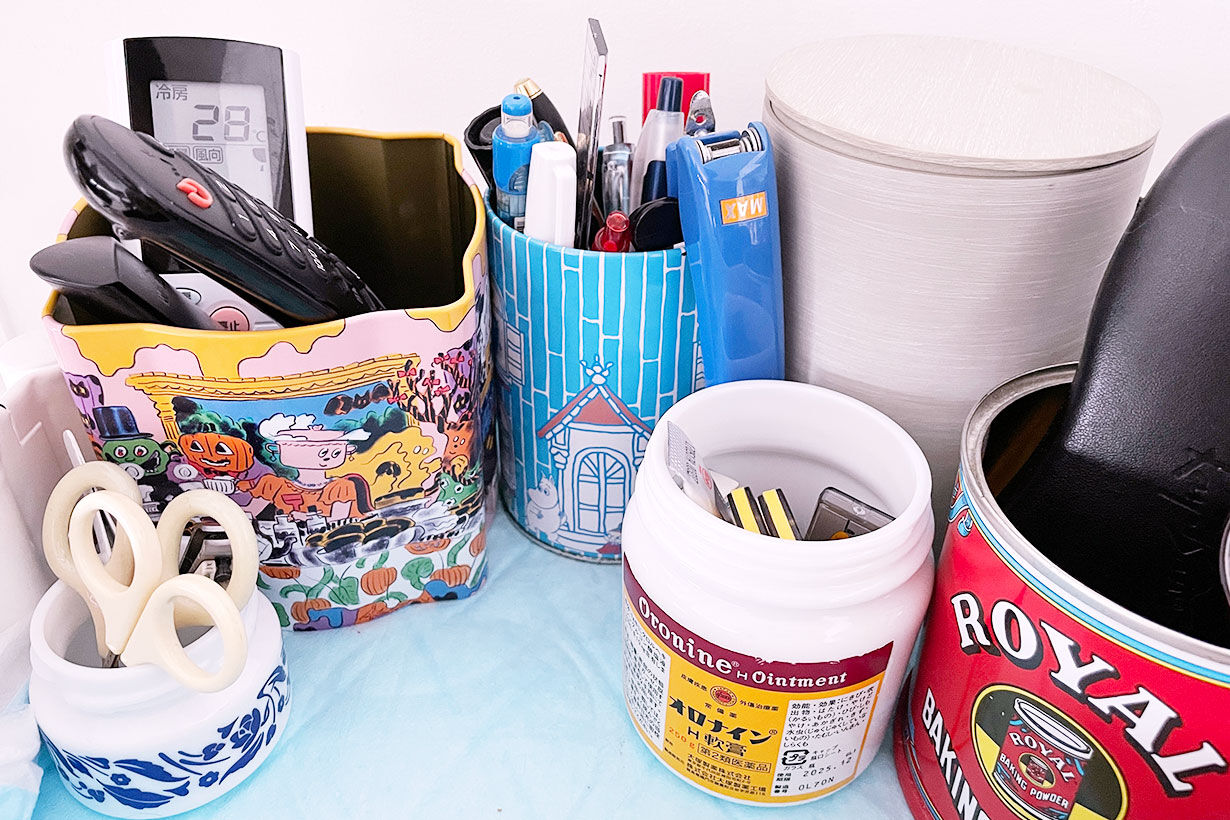 上段に、デスクに座って取り出したいリモコンや文房具などを、カテゴリ別に缶に分けて整理。