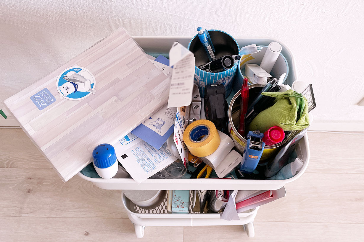 こうならないために、ものの定位置を考え、ワゴン上段全てを立てる収納に変更しました。
