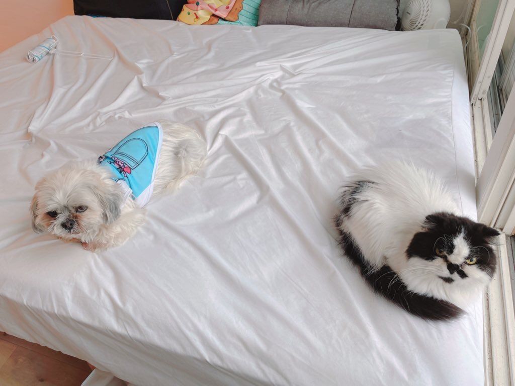 全然仲良くはないのですが、いい感じの距離感で、ベッドの上で何時間も並んで過ごしてたりするので、決して仲悪くはない2匹です。