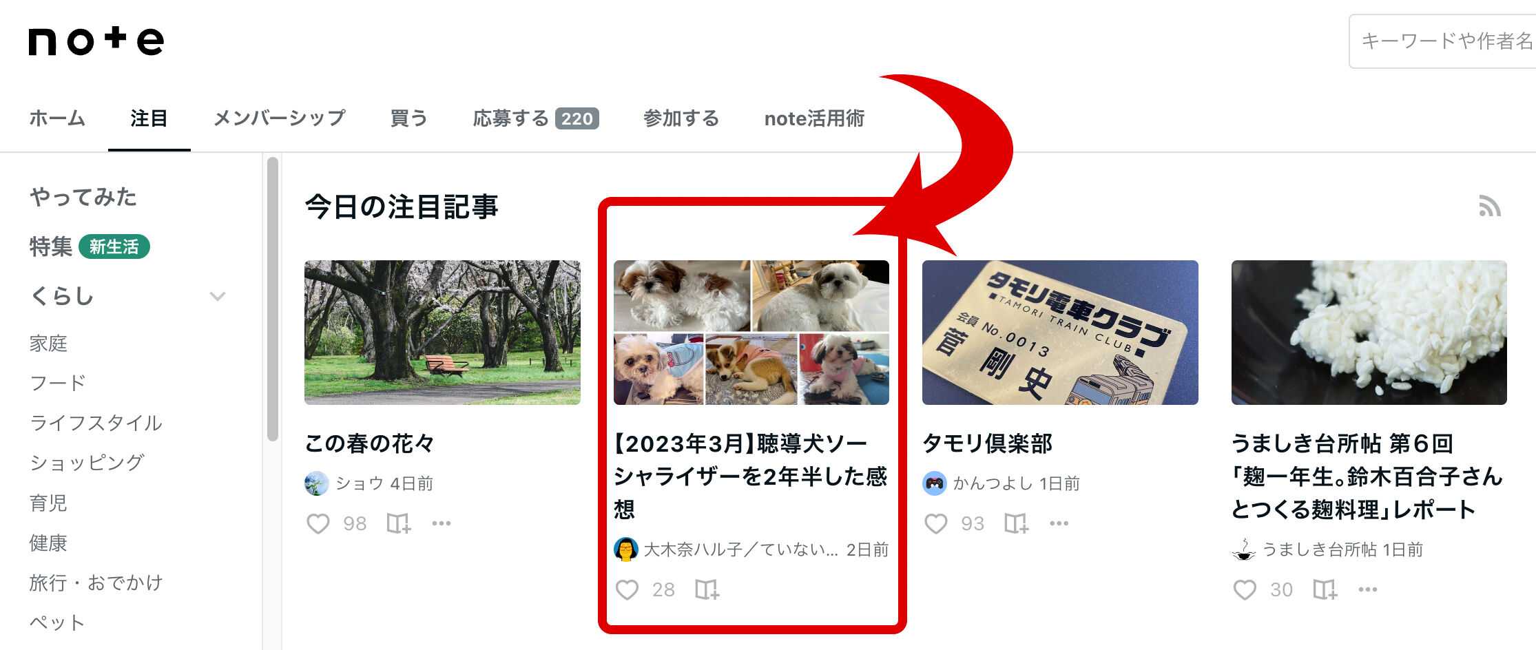 noteというメディアプラットフォーム(ブログみたいなやつ)に、聴導犬のソーシャライザーについてまとめた記事を少しだけ書いているのですが、最近(3月27日)に投稿した記事が、note編集部の「今日の注目記事」に選んでいただけました。