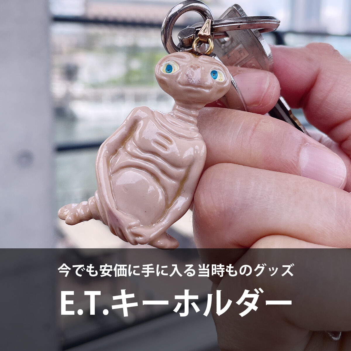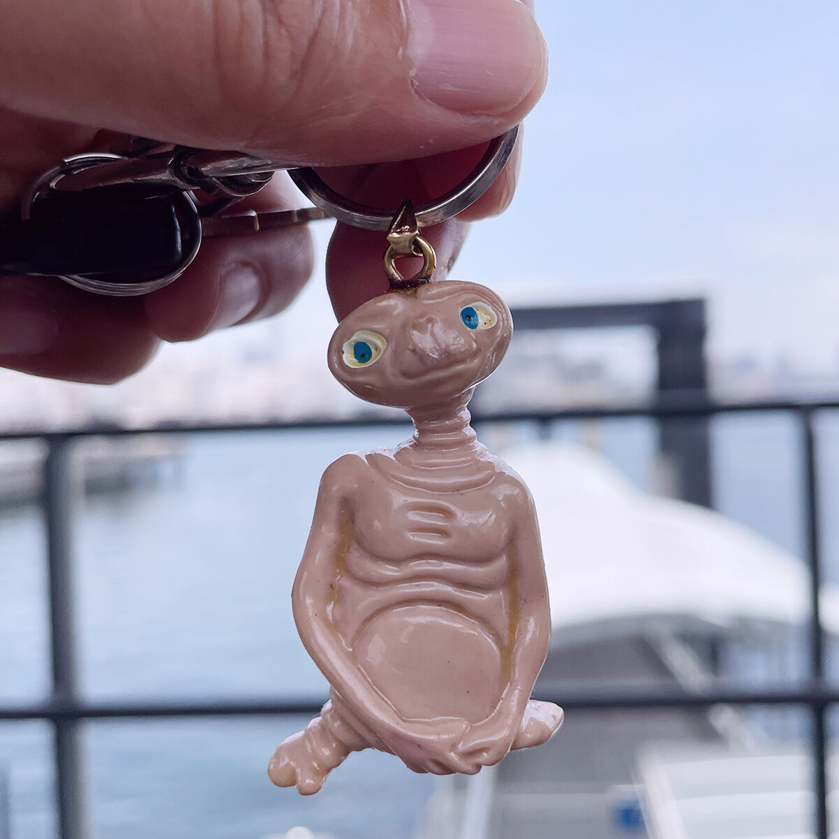 1982年の映画「E.T.」の当時もの公式グッズのネックレス(今でも楽天市場で1000円弱で入手可能)をリメイクして、キーホルダーを作りました。
