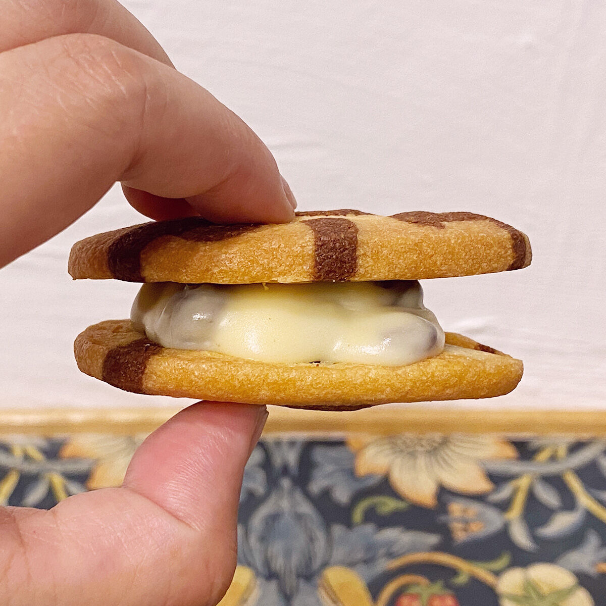 例えるならば、ホワイトチョコのトリュフの中身のガナッシュの部分をちょい硬めにしてクッキーで挟んだ感じよ。
