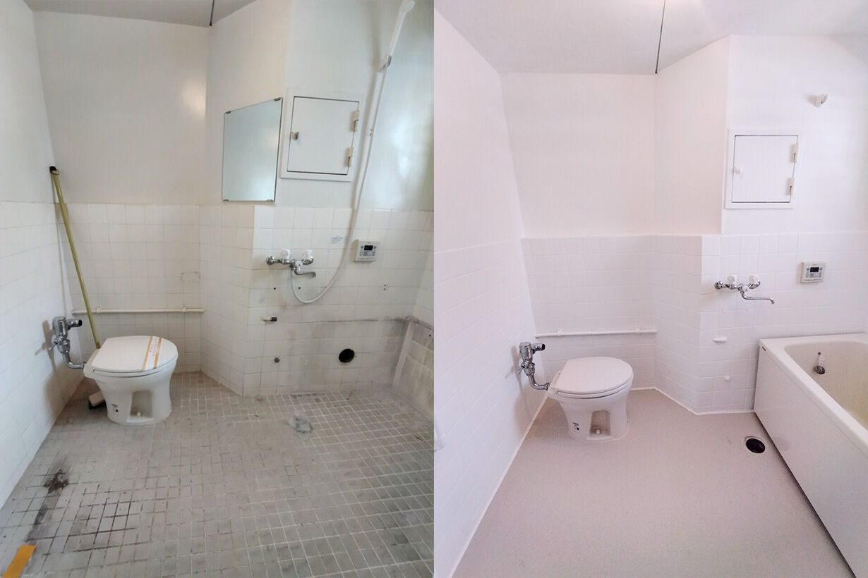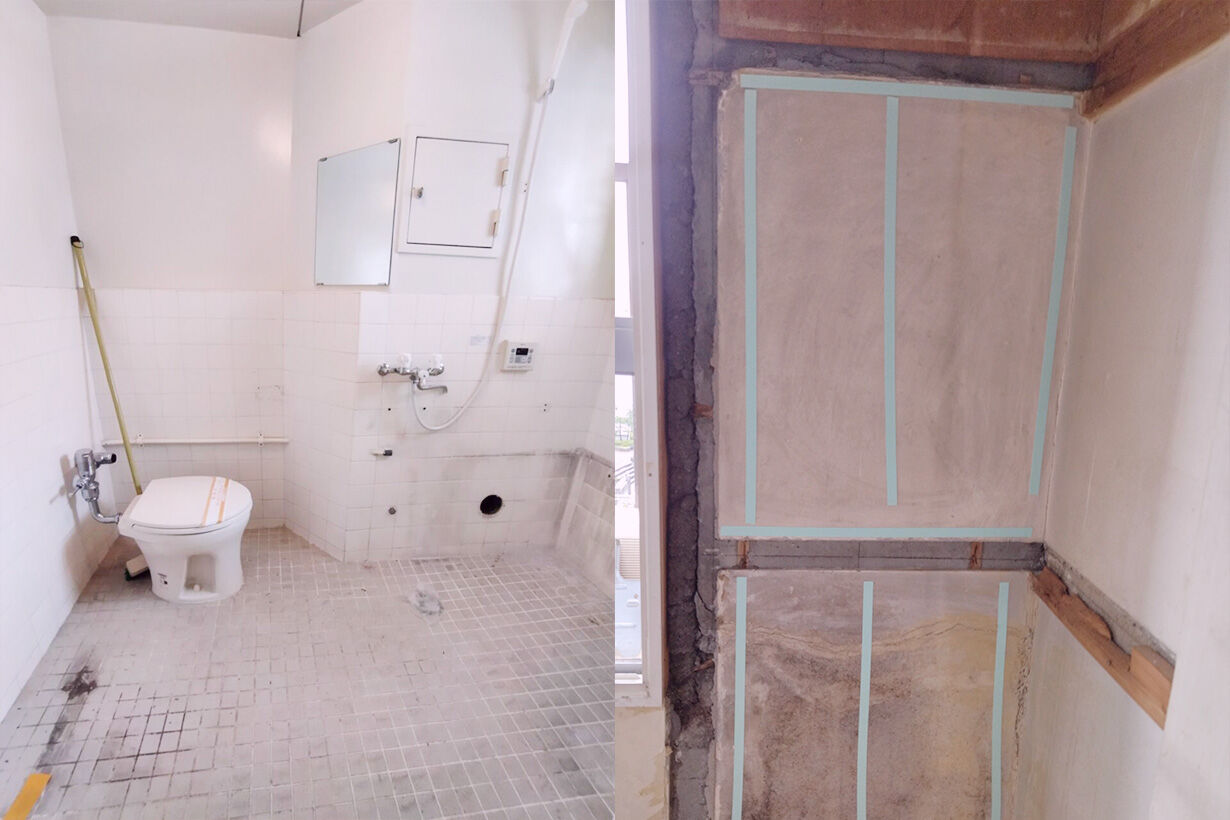 写真左は、ボロボロだったトイレとお風呂場。