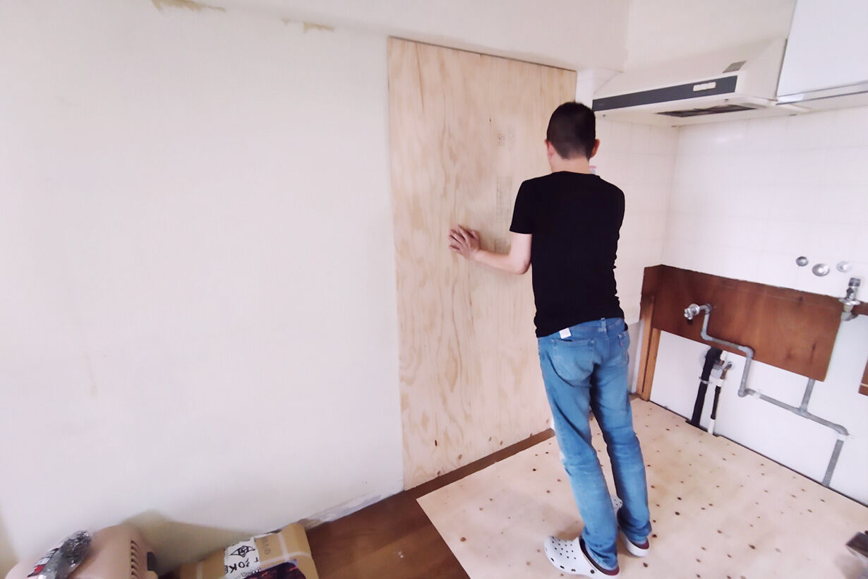 壁はボロボロでどうしたらいいかわからなかったので、両面テープで構造用合板をくっつけて塞いでから、釘で固定。