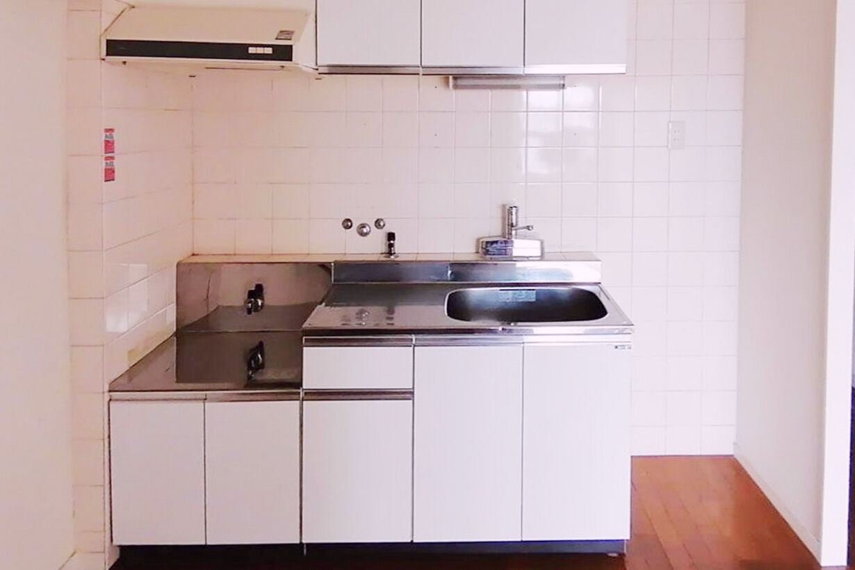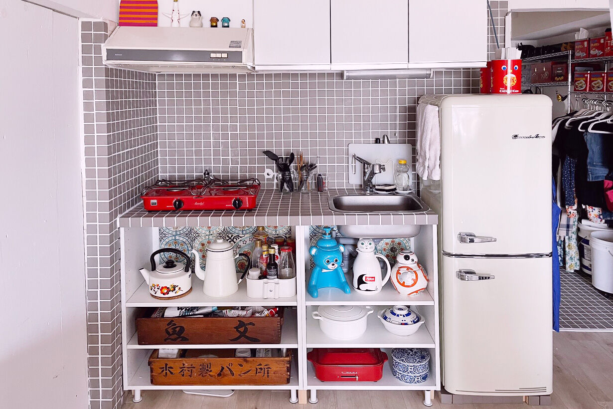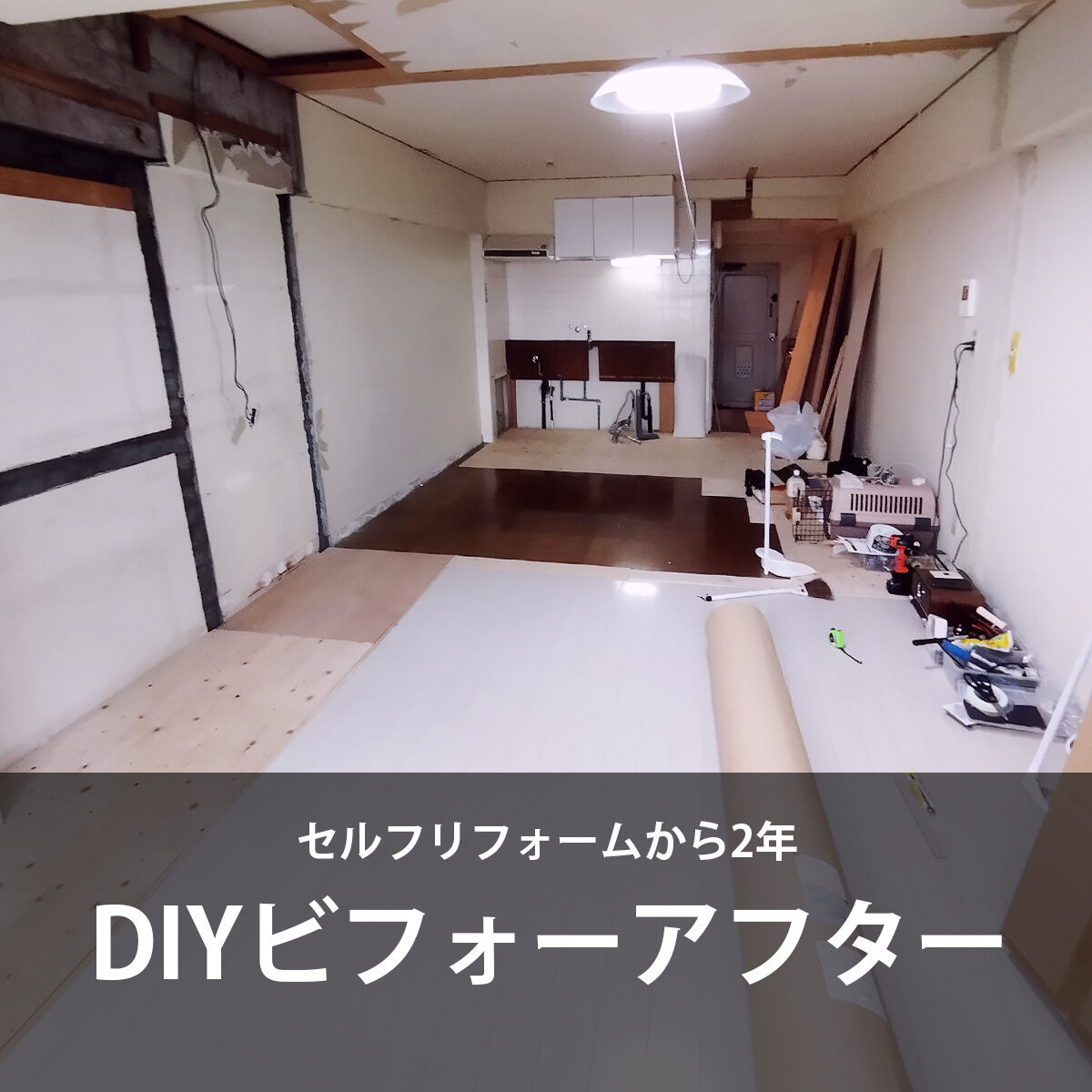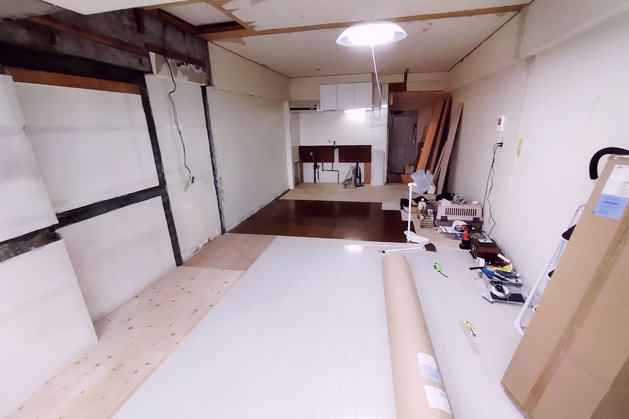 もともと、4畳のダイニングキッチン6畳の居室の1DKを、ぶちぬいて、押し入れやパントリー(っぽいもの入れ)を全部ぶっ壊して、12畳弱の箱みたいにしています。