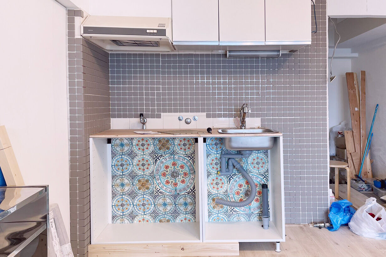 IKEAのキャビネットに切り出した板を乗せて、真ん中をくり抜いてシンクを取り付けるという、素人だからこその魔改造バージョンです。