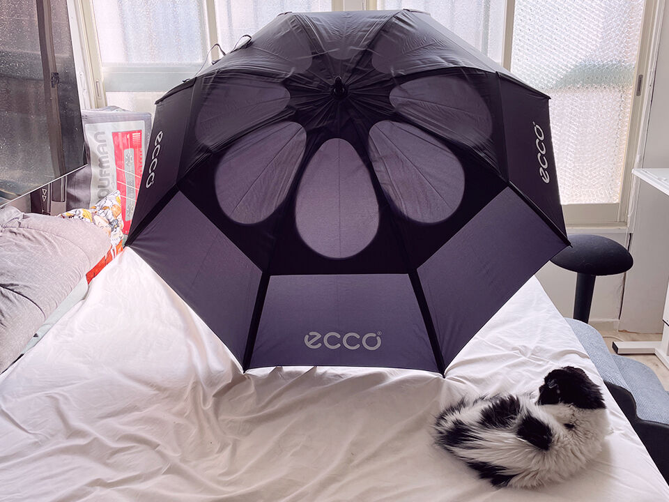 プロ仕様のゴルフ用の傘。税込2000円で買ったけど、定価150ドル(日本未発売だけど今の円ルートに換算すると22,000円)らしいので、90%以上オフです。